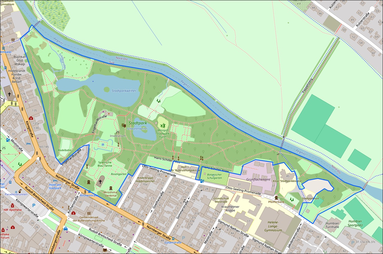 Unser neuer Zweit-Admin Heiko bringt einiges an Knowhow aus dem OpenStreeMap-Universum mit, welches ihn – und damit bald auch andere Teammitglieder – zu allerlei erstaunlichen und hilfreichen Visualisierungen befähigt. Seien es Linien oder Flächen, es lassen sich in den vielen Karten und Plänen des FürthWikis zum Exempel optisch auffällig darstellen: