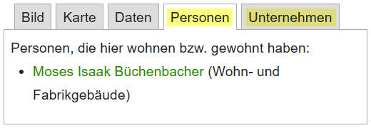 ... dass die Fak­ten­bo­xen von Ge­bäu­de-Sei­ten jetzt auch an­zei­gen kön­nen, wel­che Per­so­nen oder Un­ter­neh­men hier re­si­die­ren oder frü­her ein­mal an­säs­sig wa­ren?